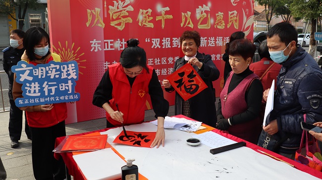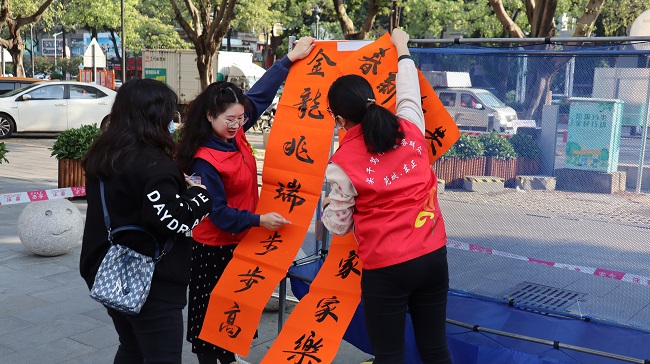 活動現(xiàn)場,雙方員工分工合作,布置場地、鋪好紅紙、揮毫潑墨,以筆墨承載祝福,把一副副寓意吉祥的春聯(lián)與關(guān)愛送到市民手中,為即將到來的春節(jié)增添了不少喜慶氛圍。